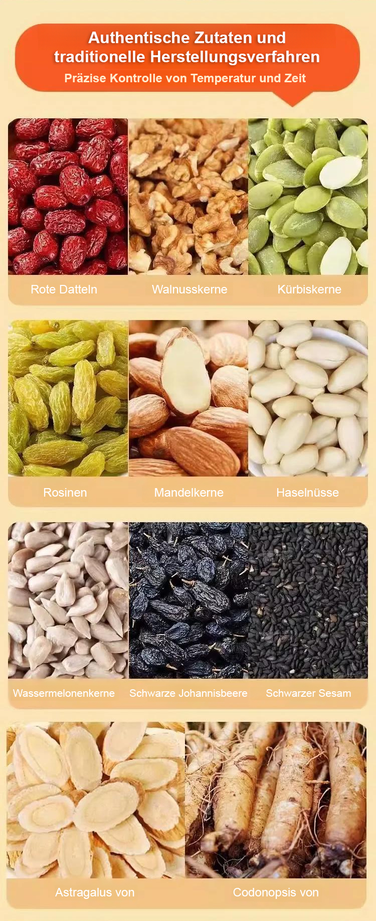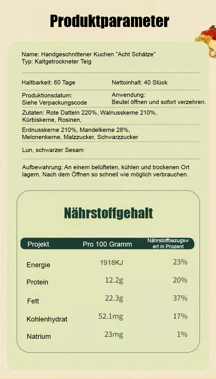 Essen Sie täglich zwei Stücke Acht-Schätze-Kuchen. Knusprig, süß und zuckerfrei.